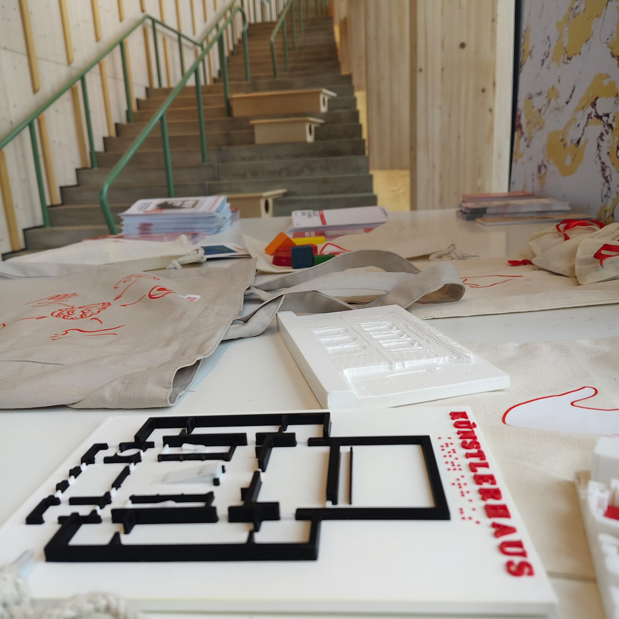 Eine multisensorische Museumstasche ist ein Vermittlungsformat, das Besucher:innen einlädt, eine Ausstellung aktiv mit allen Sinnen zu erkunden – tastend, hörend, sehend und im Dialog mit den Kunstwerken. Statt Kunst nur zu betrachten, wird sie erlebt. Die Tasche enthält mehrere kleine Module, die je nach Ausstellung variieren und interaktive Zugänge ermöglichen. Ein zentrales, konstantes Element ist ein taktiler Grundriss des Museums, entwickelt gemeinsam mit dem Projektpartner Alija Sabic FH Technikum Wien, der Orientierung und haptische Erfahrung verbindet. Im Künstlerhaus Wien wird dieses Konzept so umgesetzt, dass jede Ausstellung ihre eigene sensorische Dramaturgie erhält: Mal laden Materialien zum Ertasten ein, mal „spricht“ ein Kunstwerk oder eine Künstler:innenstimme zu den Besucher:innen.